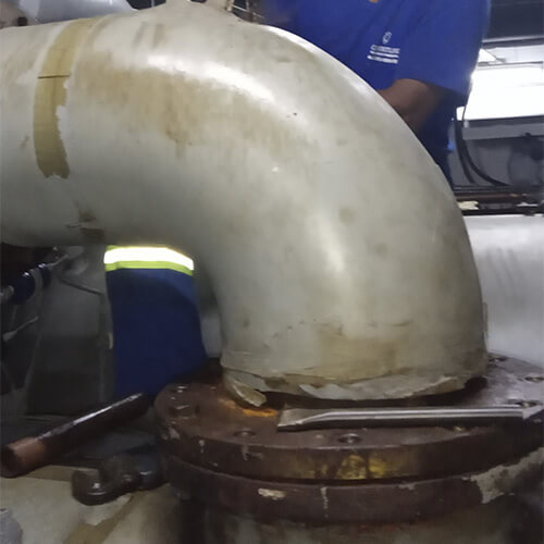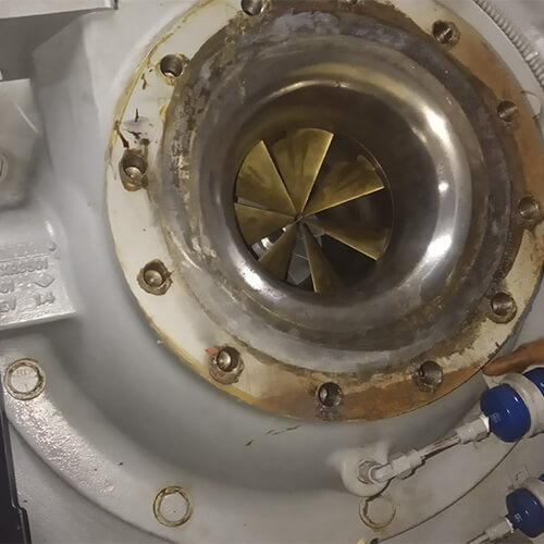 Remoção do tubo da sucção e desmontagem da parte frontal do compressor centrifugo, com desmontagem do sistema da Guide Vane, após a revisão mecânica, foi feito a remontagem do compressor e o equipamento ficou funcionando perfeitamente.
